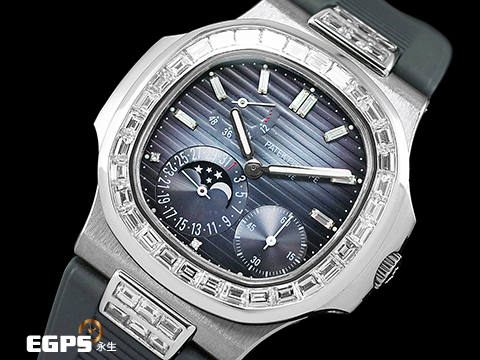 熱門超訂價款,大PP印記,精鑲大梯鑽框、精鑲梯鑽時標漸層藍面盤,搭配極具質感且充滿年輕氣息的全新RUBBER B灰色橡膠錶帶