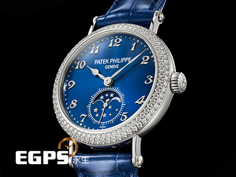 原廠鑲嵌132 顆鑽石(1.09 克拉)錶圈 月相顯示 藍色面盤