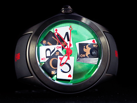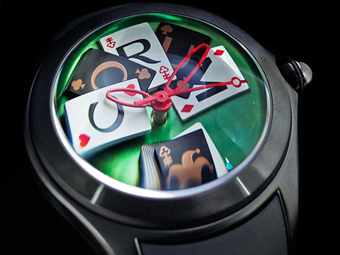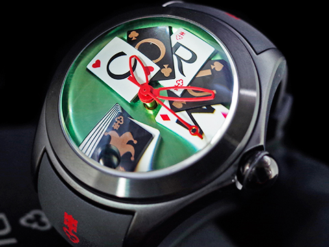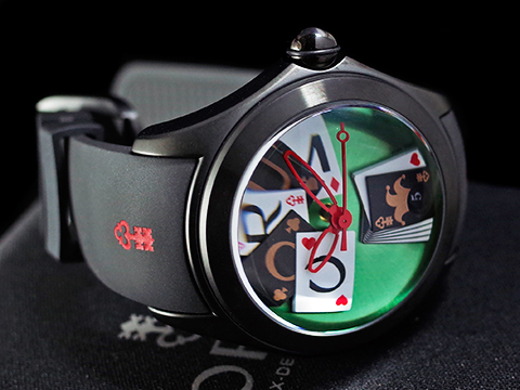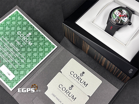 | CORUM 崑崙 Bubble 泡泡錶 L082 / 03245 大泡泡神奇博彩腕錶 Poker Games 黑色PVD不鏽鋼金屬材質 特殊半球體拱形雙面玻璃鏡面 撲克牌桌彩繪面盤 全球限量88只 自動上鍊 42mm |