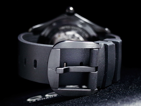黑色PVD不鏽鋼材質錶殼 / 撲克牌桌彩繪面盤 / 原廠黑色橡膠錶帶 / 半球體拱形雙面藍寶石水晶玻璃鏡面及透明錶背 |