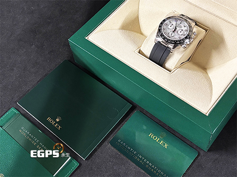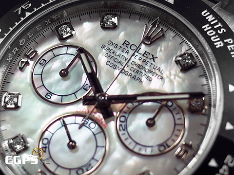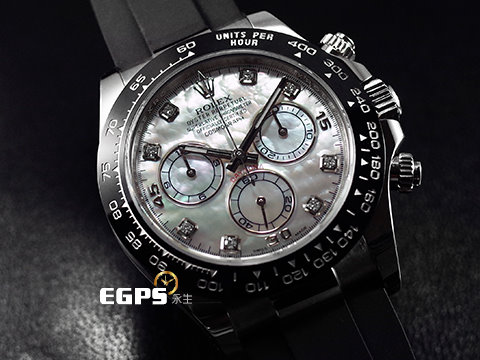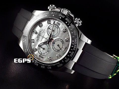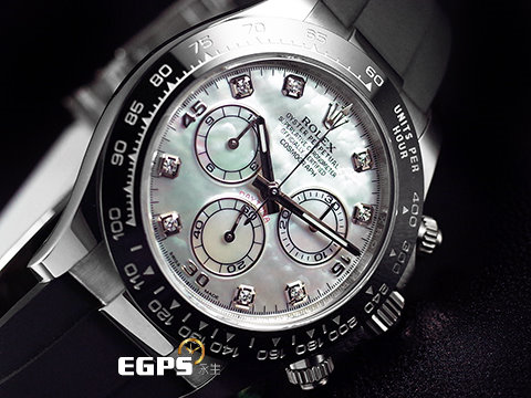 18K白金材質錶殼、計速儀刻度陶瓷錶圈、旋入式錶冠、計時按鈕及摺疊帶扣 / 稀有白色珍珠貝母鑲鑽面盤 / 夜光指針及時標 / 原廠黑色Oysterflex橡膠錶帶 / 藍寶石水晶玻璃鏡面 |