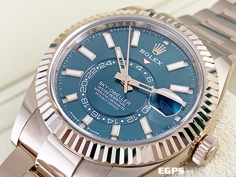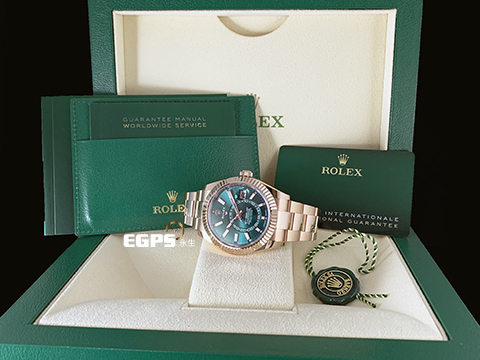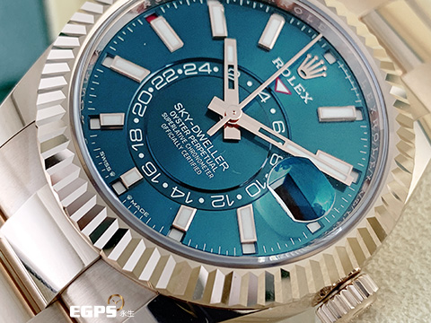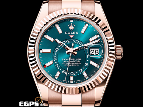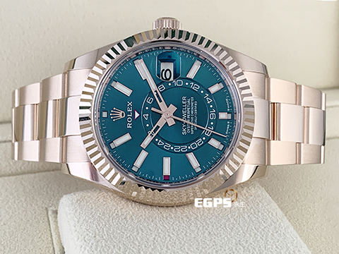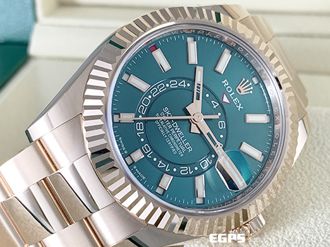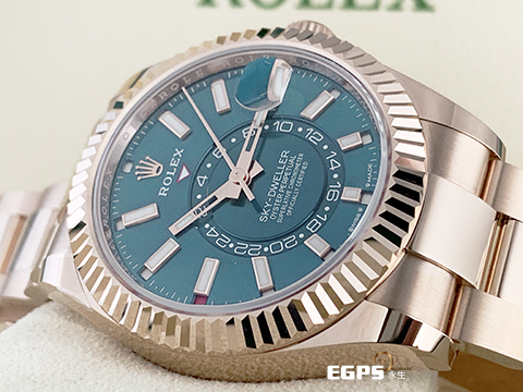 ROLEX 勞力士 Sky-Dweller 蠔式 天行者 336935 最新9002新機芯 藍綠色面盤 永恆玫瑰金 沙羅系統 年曆錶 兩地時區 經典三角坑紋錶圈 2024年保卡 蠔式(Oyster)三節錶帶 自動上鍊 42mm |