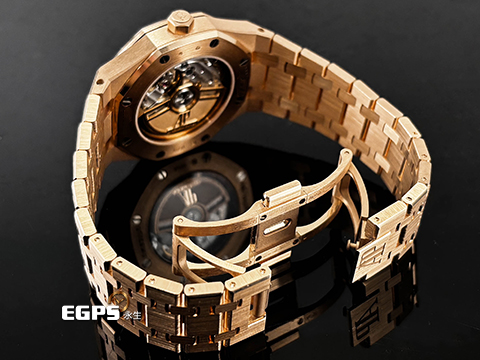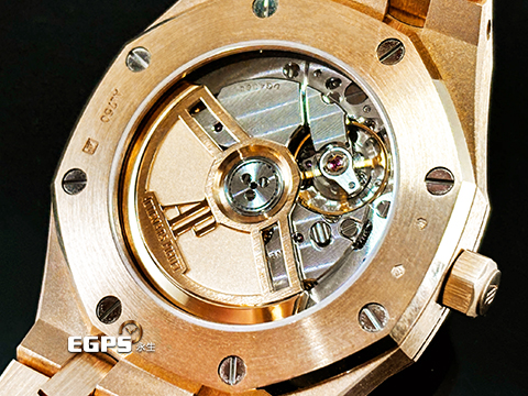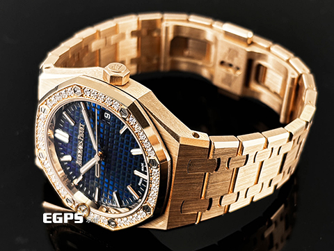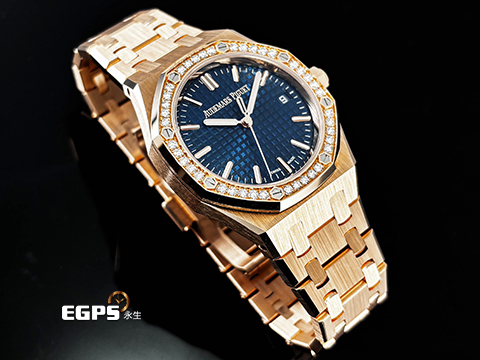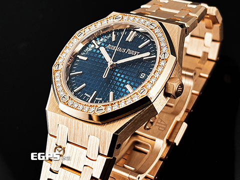 皇家橡樹獨特八角形螺絲外錶圈 / 18K玫瑰金材質錶殼、錶鍊帶及AP字樣摺疊扣 / 鐫刻「Grande Tapisserie」大型格紋裝飾圖案午夜藍色錶盤 / 夜光指針、夜光時標 / 藍寶石水晶玻璃鏡面 / 玫瑰金自動盤 |