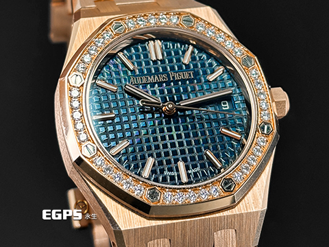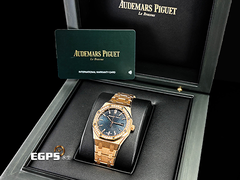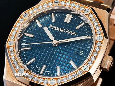 Audemars Piguet 愛彼 AP錶 Royal Oak 皇家橡樹 77451OR.ZZ.1361OR.04 18K玫瑰金材質 午夜藍色Grande Tapisserie錶盤 40顆原廠鑲嵌美鑽錶圈(約重0.71克拉)2023年新式保卡 自動上鍊 34mm |