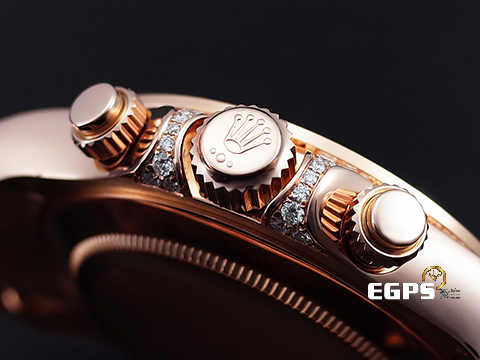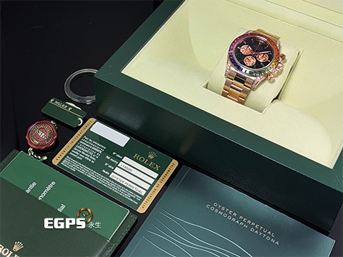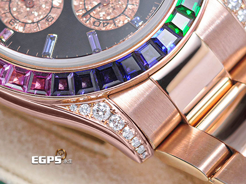 Oyster Perpetual Cosmograph Daytona在錶殼與鍊帶材質採用勞力士專利的永恆玫瑰金,由於在玫瑰金裡加入一定比例的鉑金材質,讓玫瑰金能永保亮澤,將錶戴上手更襯女性氣質,男性上手也更斯文。此外,玫瑰金版Daytona彩虹圈與前代最大的差異在於錶盤上的時標由原本的8個鑽飾時標改成11個彩色藍寶石,在腕錶整體視覺更一致,也是這款Daytona頗受注目的特色賣點。