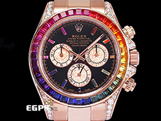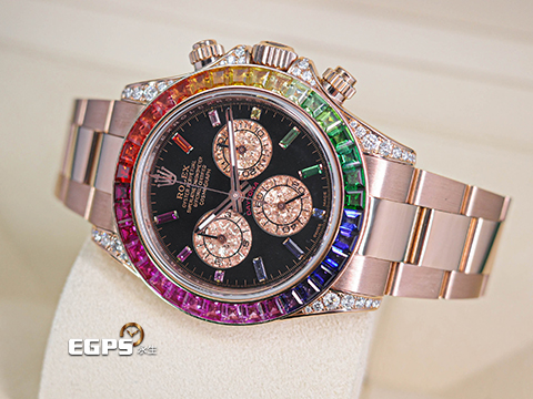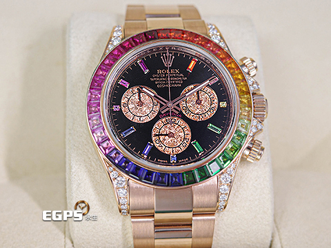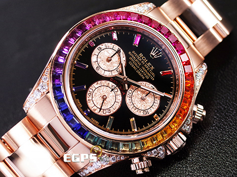 ROLEX 勞力士 DAYTONA 迪通拿 116505 18K玫瑰金材質 鍊帶款 計時碼表 自動上鍊 精鑲漸層彩紅色寶石於錶圈及時標 精鑲鑽石於錶耳及護肩 看不到也買不到的116595 RBOW彩紅寶石圈,現在只以一百多萬便能擁有迷倒眾人的彩虹圈,還不趕快過來賞錶!!自動上鍊 40mm |