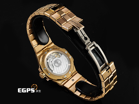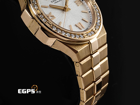 18K材質錶殼、錶鍊帶及摺疊扣 / 原廠鑲嵌鑽石錶圈 / 銀白色拉絲紋面盤 / 鍍金夜光指針及羅馬時標 / 防眩光藍寶石水晶玻璃鏡面 / 透明錶背 |