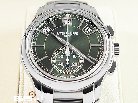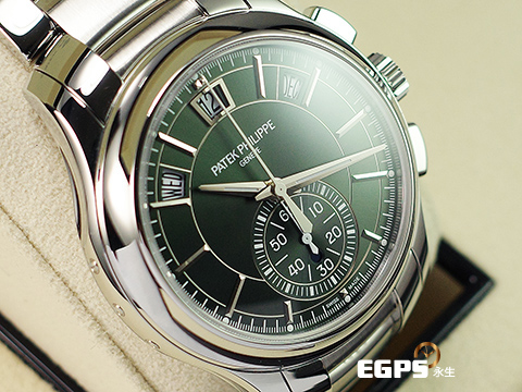 Patek Philippe 百達翡麗 PP錶 Complications 複雜功能時計 5905/1A-001 橄欖綠色日輝紋面盤 飛返計時 年曆錶 2025年保單 按動式摺疊扣 新錶訂價:2,103,000元 自動上鍊 42mm |