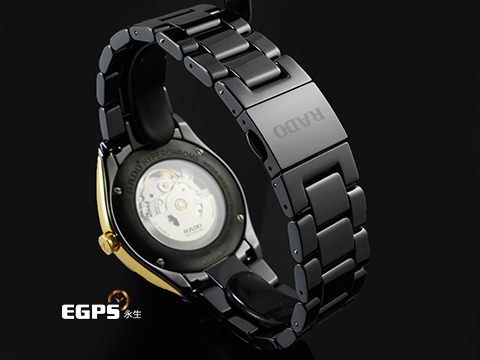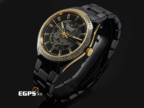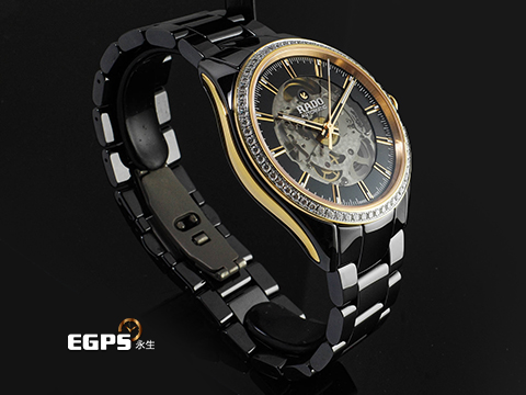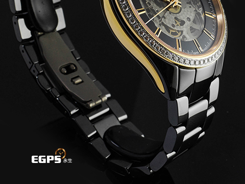 黑色陶瓷材質錶殼、鏈帶 / 原廠鑲嵌鑽石PVD鍍金錶圈 / 鏤空面盤 / 透明底蓋 / 夜光指針 / 藍寶石水晶玻璃鏡面