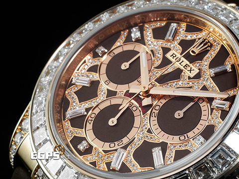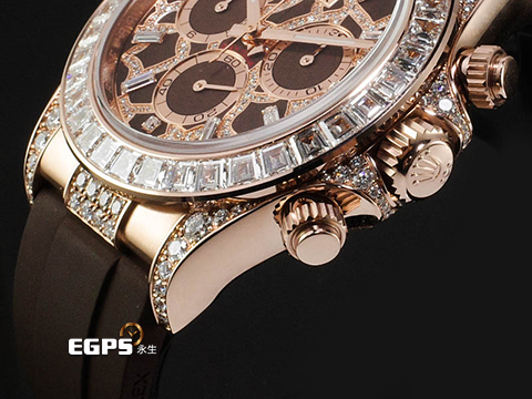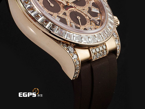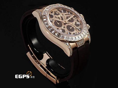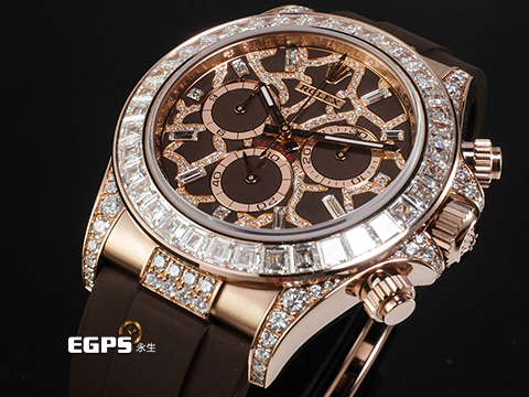 18K永恆玫瑰金材質錶殼、摺疊扣、旋入式錶冠、視距儀刻度錶框 / 原廠鑲嵌鑽石面盤、錶耳 / 原廠鑲嵌36顆梯形鑽石錶圈 / 原廠快條功能棕色橡膠Oysterflex錶帶 / 夜光指針 / 藍寶石水晶玻璃 / 防偽內圈 |