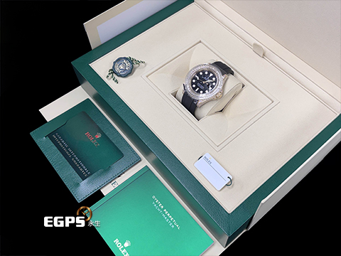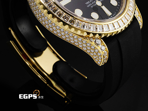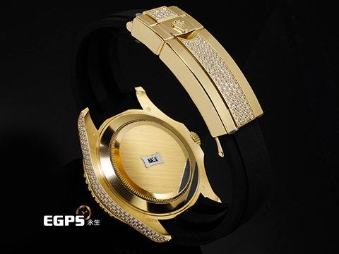 18k黃金材質錶殼、錶帶、原鑲鑽石摺疊扣、旋入式錶冠 原鑲滿鑽錶殼 / 黑色面盤 / 夜光賓士指針、時標 / Cerachrom黑色陶瓷刻度雙向旋轉錶框 / Oysterflex黑色橡膠錶帶 / Glidelock延展系統蠔式保險扣 / 藍寶石水晶玻璃鏡面