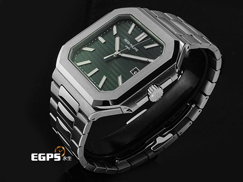 不鏽鋼材質錶殼、鍊帶、摺疊式錶扣 / 綠色日輝紋錶盤,水平橫紋浮雕圖案 / 覆白色螢光塗層的玫瑰金立體時標 / 藍寶石水晶玻璃鏡面及透明錶背 / 21K金水準橫紋圖案中央自動盤
