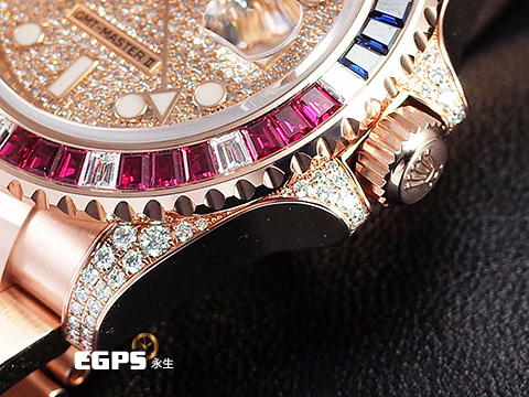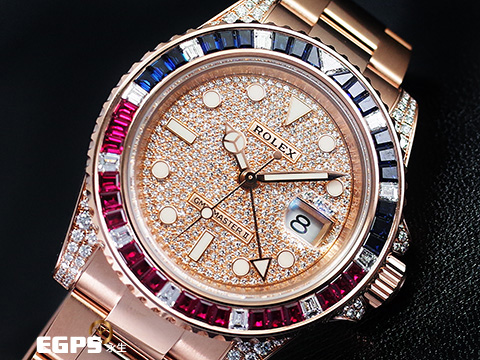 | ROLEX 勞力士 GMT-MASTER II 格林威治型 18K永恆玫瑰金材質 126755SARU-PAVE DIAL 原鑲藍紅寶石錶圈 兩地時區 頂級百事圈!稀有夢幻收藏款!原鑲滿天星鑽石面盤 2021年單 新式綠卡 自動上鏈 40mm |
