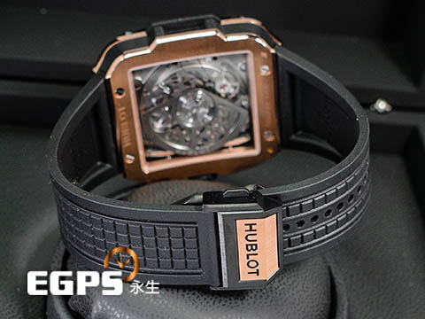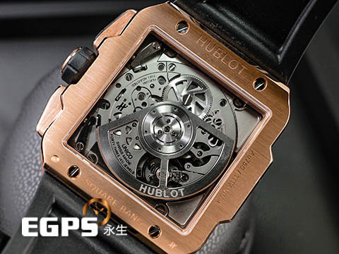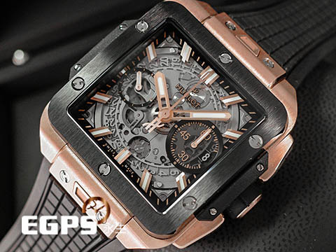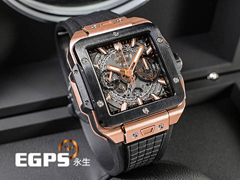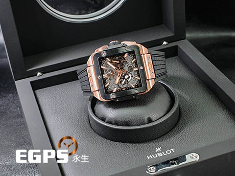| HUBLOT 宇舶 Square Bang Unico系列 821.OM.0180.RX 三日鍊 飛返 計時碼表 King Gold 王金材質 方形 陶瓷外圈 鏤空面盤 2024年電子保單 自動上鍊 42mm |