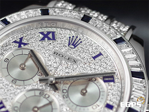 18K白金材質錶殼及折疊帶扣 / 原鑲滿天星鑽石面盤 / 原鑲大梯鑽+12藍寶石錶圈 / 旋入式錶冠及計時按鈕 / 原廠藍色皮帶 / 藍寶石水晶玻璃鏡面 |