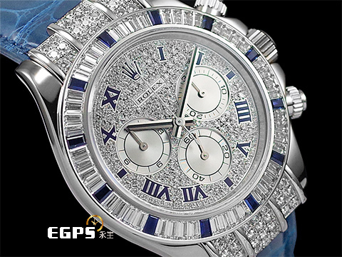 | ROLEX 勞力士 Daytona 迪通拿 116599-12SA 計時碼表 116599SA 白K金材質 原鑲大梯鑽+藍寶石錶圈、滿鑲滿天星面盤!稀有琺瑯羅馬數字時標 防偽內圈 自動上鍊 40mm |
