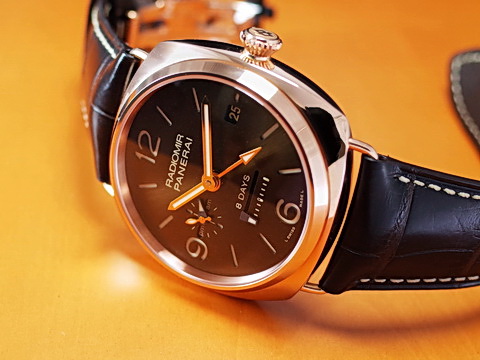 P.2002¦Û»s¾÷ªä§¹¥þ¥Ñ¨K¯Ç®ü³]p©M¬ã»s¡A¬O¤@´Ú°t³Æ¤F¤é´Á¡B²Ä¤G®É°ÏÅã¥Ü©M¬í°wÂk¹s¸Ë¸mªº¤â°Ê¤WÃì¾÷ªä¡C¸Ó¾÷ªä¨ã¦³ªø®Ä¯à¤K¤é°Ê¤OÀx¦s¡A¦p¦¹ªøªº®É¶¡¬O¬°¤F¨¾¤î¹L©óÀWÁc¾Þ§@¤WÃì¿ö«a¡A¦Ó¦¦b1940¦~¥N¨K¯Ç®üµÃ¿ö¤w±Ä¥Î¦¹¶µ³]p¡C¦b¦p¦¹ªø¤[ªº°Ê¤OÀx¦s¬O³q¹L¤TÓ¬Û³sªºµo±ø²°¡]¨K¯Ç®ü±M§Q¡^¹F¦¨ªº¡A½T«O³sÄò¤K¤Ñ¥HùÚ©w²£¥Í³Ì¨Î°Ê¤O¡CPAM00395 - Radiomir 8 Days GMT Oro Rosso 8¤é°Ê¤O¨â¦a®É¶¡¬õª÷µÃ¿ö¡A¨ä¨¾¤ô²`¹F50¦Ì¡A¨Ã°t³Æ´Ä¦âÆs³½¥Ö¿ö±a©M¥i½Õ¸`¦¡¬õª÷¿ö¦©¡C