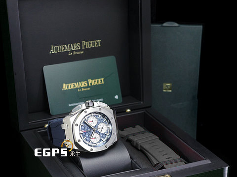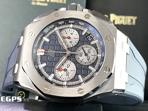 | Audemars Piguet 愛彼 AP錶 Royal Oak Offshore 皇家橡樹 離岸型 26420TI.OO.A027CA.01「Mega Tapisserie」超大型格紋藍色面盤 26420 TI 飛返 計時碼錶 鈦金屬 2021年保單 新式快拆錶帶 搭載全新4401機芯 自動上鏈 43mm |