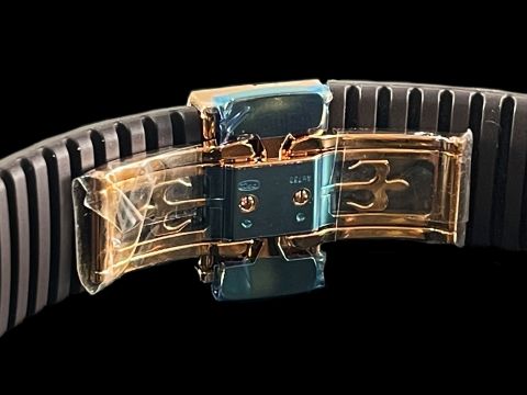 玫瑰金材質錶殼、摺疊扣、旋入式錶冠 / 黑色漸變效果的棕色日輝紋錶盤 / 立體阿拉伯數字夜光時標及指針 / 全新原廠深棕色格紋橡膠錶帶 / 藍寶石水晶玻璃鏡面及透明錶背 |