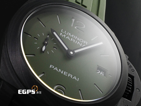 | PANERAI 沛納海 Luminor Quarantta Carbotech PAM01526 PAM1526 碳纖維材質 軍綠色面盤 錶帶快拆式功能 三日鍊 小秒針 2026年保卡 自動上鍊 40mm |