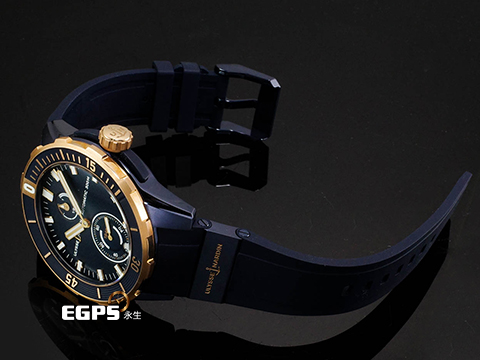 | Ulysse Nardin 雅典 Diver Collection 1185-170/BLUE 半金款 玫瑰金+藍色PVD塗層材質 小秒針 動能顯示 潛水錶 2025年保卡 自動上鍊 44mm |