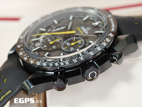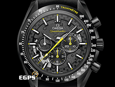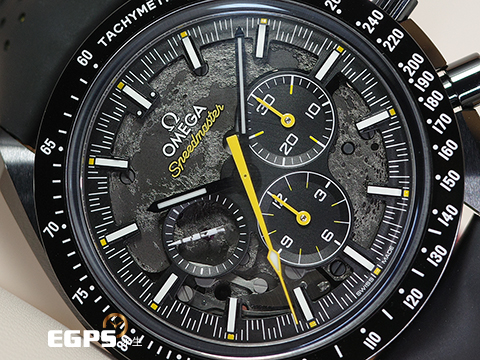 極富傳奇色彩的歐米茄超霸錶參與過全部六次登月任務,堪稱真正的太空經典,亦代表了歐米茄的先鋒精神。 在此44.25毫米錶款中,黑色機芯以鐳射刻蝕於主機板及橋板之上,呈現月球表面圖像,禮讚超霸錶的阿波羅8號任務歷史。透過經陽極處理的鏤空黑色鋁錶盤可觀看到月球近側,而透過錶背則可欣賞到月球的遠側。 腕錶襯以帶黃色橡膠襯裡的黑色穿孔橡膠錶帶,整只腕錶均以黑色陶瓷製成,設有黃色亮漆計時秒針,錶圈以鐳射鐫刻測速刻度,並內填白色琺瑯。小秒針副錶盤(正在申請專利)亦設有外型如土星五號火箭的5級鈦金屬指針。3D造型由鐳射車削製成,顏色則來自白清漆、蝕刻和鐳射黑化處理。 腕錶搭載經過華麗裝飾的歐米茄3869同軸擒縱大師天文台認證機芯,錶背鐫刻有「APOLLO 8, DEC 1968」、「DARK SIDE OF THE MOON」、「WE’LL SEE YOU ON THE OTHER SIDE」及「CO-AXIAL MASTER CHRONOMETER」等字樣。