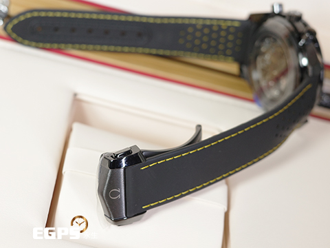 材質: 黑色陶瓷錶殼、帶扣、錶冠及計時按把 / 黑色鏤空面盤、黑色計速儀刻度錶圈 / 鈦金屬土星5號火箭小秒針 / 夜光指針及時標 / 藍寶石水晶玻璃鏡面及透明錶背