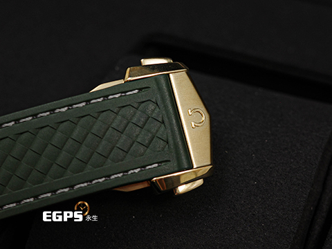 腕錶襯以綴有灰色縫線的整合式綠色格紋橡膠錶帶,並附有18K Moonshine?金摺疊錶扣。