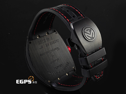 碳纖維材質酒桶型錶殼及按動式折疊帶扣 / 黑色面盤 / 立體手工打磨紅色金屬邊阿拉伯數字時標 / 夜光指針 / 旋入式錶冠 / 黑色皮革錶帶 / 弧形藍寶石水晶玻璃鏡面 |