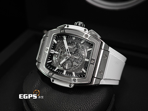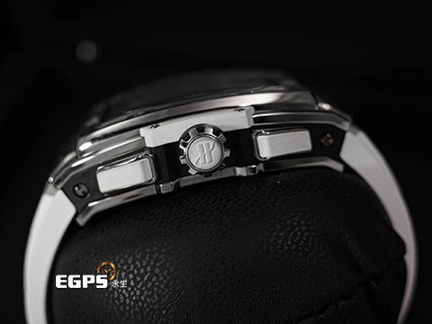 緞面及拋光鈦金屬、白色橡膠材質複合式錶殼、鈦金屬按動式摺疊帶扣 / 鏤空面盤 / 夜光指針及時標 / 客製化白色橡膠錶帶 / 藍寶石水晶玻璃鏡面及透明錶背 |