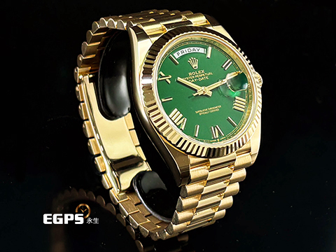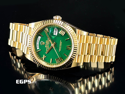 | ROLEX 勞力士 DAY-DATE 40 DD 蠔式星期日曆型 228238 18黃金材質 18K黃金羅馬數字時標 綠色面盤 賭桌綠在手,勝率跟你走 2026年保卡 自動上鏈 40mm |