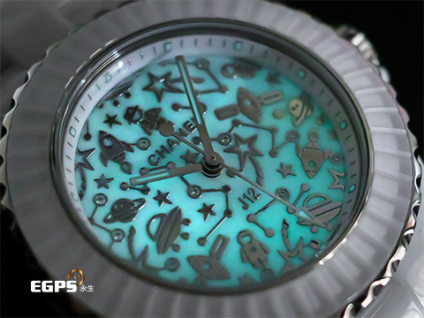 | CHANEL 香奈兒 J12 Cosmic H7990 White Ceramic 白色陶瓷 螢光科幻宇宙時空面盤 (以Super-LumiNova藍色夜光元素,搭配拋光鍍銠圖騰,鑲嵌12顆明亮式切割鑽石)白色清漆長階梯形水晶錶圈 專利不鏽鋼蝴蝶扣 2024年保卡 石英機芯 33mm |