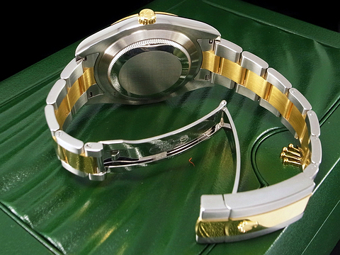 18K黃金搭配不鏽鋼材質錶殼、錶鍊帶及折疊帶扣 / 金色面盤 / 勞力士原廠鑲嵌10顆鑽石時標 / 旋入式錶冠 / 藍寶石水晶玻璃鏡面 / 防偽內圈 |