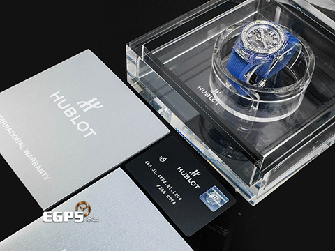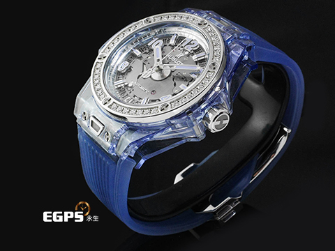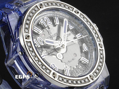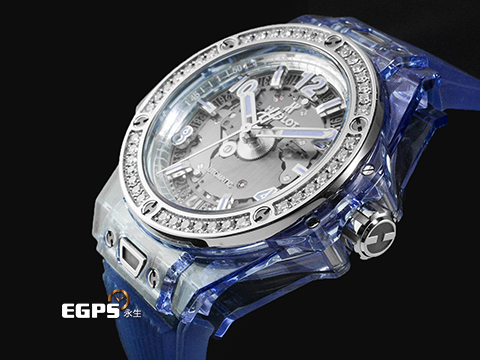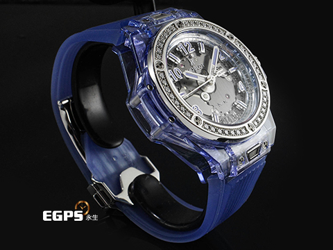 | HUBLOT 宇舶 Big Bang One Click Blue Sapphire 大爆炸 465.JL.4802.RT.1204 極少見薰衣草色藍寶石水晶材質錶殼 原廠鑽圈 大三針 鏤空面盤 2019年保卡 限量200支 典藏全透明錶盒 自動上鍊 39mm |