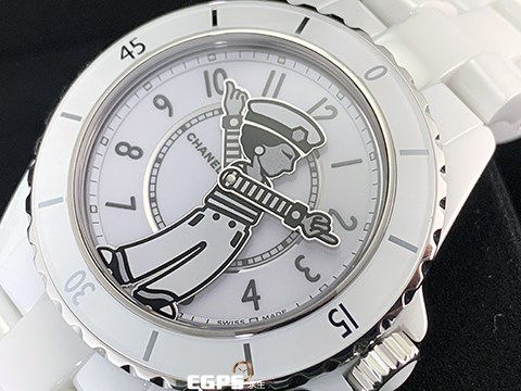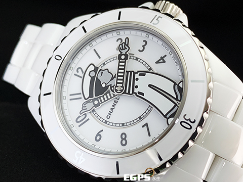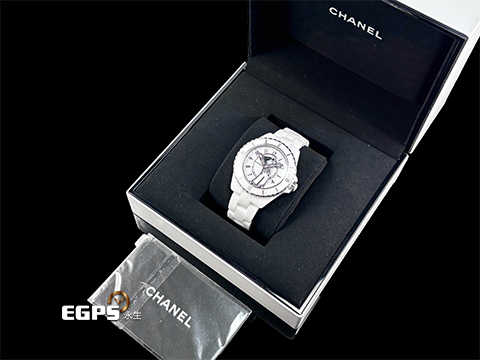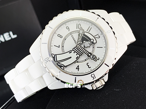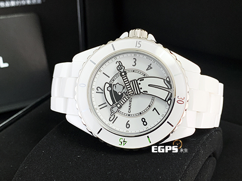 | CHANEL 香奈兒 Mademoiselle J12 La Pausa H7481 白陶瓷 香奈兒女士身著經典條紋上衣搭配鈕扣褲裝,率性俐落,2025年保單 專利不鏽鋼蝴蝶扣 自動上鍊 38mm |