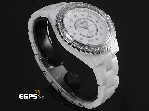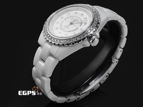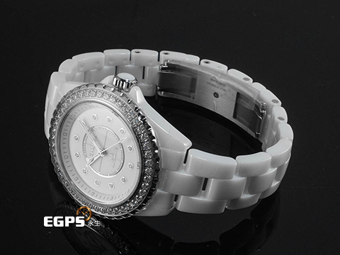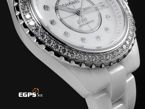 | CHANEL 香奈兒 J12 Caliber 12.2 系列 Diamond Bezel H10473 原廠鑲嵌頂級天然美鑽 鑽石時標、鑽石外圈(共48顆 重約1.27克拉)白陶瓷 專利不鏽鋼蝴蝶扣 2025年保卡 自動上鍊 33mm |