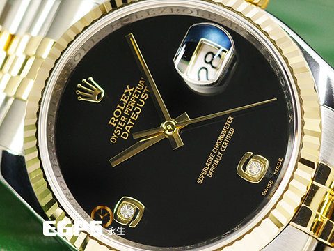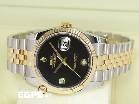 | ROLEX 勞力士 Datejust 36 蠔式日誌型 116233 2RB 半金款 18K黃金 稀有黑瑪瑙 69鑽標 無字特殊面盤 DJ36 經典三角坑紋錶圈 紀念型(Jubilee)五銖錶帶 自動上鏈 36mm |