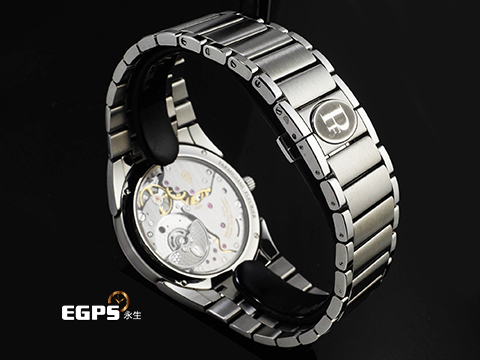 不鏽鋼材質錶殼、錶冠、鍊帶及傳統錶扣 / 奶茶色「格狀大麥粒」璣鏤飾紋面盤 / 三角形鏤空指針 / 藍寶石水晶玻璃鏡面、透明錶背 / 18K鉑金微型擺陀 |
