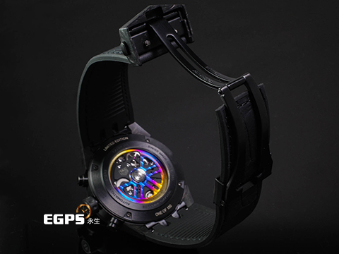 PVD塗層鈦金屬材質錶殼、錶冠及折疊扣 / 彩虹蛋白石造型錶圈 / 彩虹鏤空面盤 / 夜光指針及時標 / 藍寶石水晶玻璃鏡面及透明錶背 |