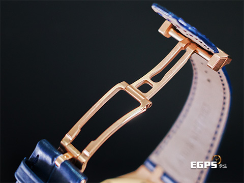 18K玫瑰金材質錶殼、旋入式錶冠 / 藍色鱷魚皮錶帶搭配18K玫瑰金AP字樣折疊扣 / 雲夜藍色鐫刻Grande Tapisserie大型格紋面盤 / 夜光玫瑰金立體時標與皇家橡樹指針 / 藍寶石水晶玻璃鏡面及透明錶背 |