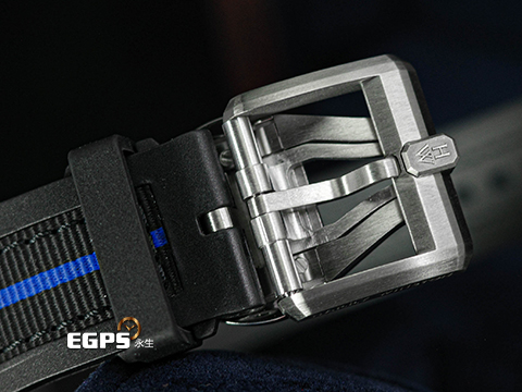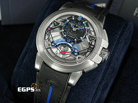 鋯合金錶殼、摺疊扣、旋入式錶冠 / 鏤空面盤、偏心時、分指示、獨立小秒針 / 藍寶石水晶玻璃 / 透明底蓋 / 橡膠編織紋錶帶