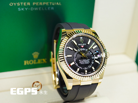 | ROLEX 勞力士 Sky-Dweller 326238 蠔式 天行者 沙羅裝置 年曆錶 18K黃金材質 自動上鏈 Oysterflex橡膠錶帶 2022年新式綠卡 放射紋亮黑面 此錶歡迎各路錶友以PP、AP、勞力士 來店交換,本店將以最高價評估∼ 42mm |