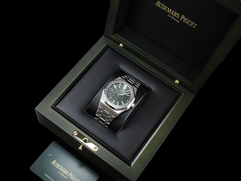 不鏽鋼材質錶殼、旋入式錶冠、錶鍊帶及折疊帶扣 / 軍綠色鐫刻Grande Tapisserie大型格紋面盤 / 藍寶石水晶玻璃鏡面及透明錶背 / AP字樣K金自動盤 |