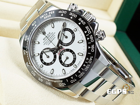 全新的勞力士迪通拿,英文全名 Oyster Perpetual Cosmograph Daytona 904L精鋼腕錶,配備勞力士研發及擁有專利的黑色陶質Cerachrom外圈,總共有黑色面盤配上黑色陶瓷圈,與白色面盤配上黑色陶瓷圈二種款式。由於過去的Daytona 大多是與錶殼同色的金屬圈,這次黑色錶圈的出現,的確為這個經典錶款帶來全新的面貌。尤其是白色面盤錶款,採用了黑色的小錶圈,黑白分明,與70年代傳奇的「Panda dial 熊貓面盤」相當類似。未來,白面的肯定比黑面更加搶手。
