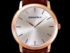 Jules Audemars超薄腕錶,18K玫瑰金錶殼,直徑41毫米,厚度6.7毫米,時分顯示,愛彼自製Cal.2120自動上鍊超薄機芯,厚度2.45毫米,動力儲存40小時,機板珍珠圓點打磨,橋板飾以日內瓦波紋及珍珠圓點打磨,邊角皆經亮面拋光打磨,藍寶石水晶透明底?,防水20米,大鱗片鱷魚皮錶帶。