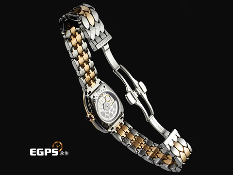 18K玫瑰金&不鏽鋼材質水滴形錶殼及折疊扣 / 白色蛋白石錶盤 / 原廠鑲嵌鑽石錶圈 / 錶冠鑲嵌蛋面型切割粉紅碧璽 / 藍寶石水晶玻璃鏡面 透明錶背 |