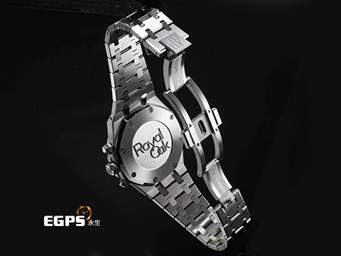 皇家橡樹獨特八角形螺絲外露設計錶框 / 不鏽鋼錶殼、錶背、金屬鍊帶、摺疊帶扣、旋入式錶冠、計時按把 / 雲夜藍50色調「Grande Tapisserie」大型格紋錶面 / 夜光指針及時標 / 藍寶石水晶玻璃鏡面 |