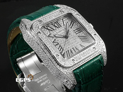 | CARTIER 卡地亞 Santos 100 山度士 中型 精鑲滿天星鑽石面盤、鑲鑽錶圈 綠色客製化皮革錶帶 自動上鍊 36mm |