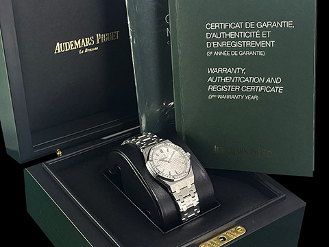 精鋼材質錶殼 . 鍊帶及單邊折疊帶扣 / 白色愛彼經典格紋面盤 / 原鑲鑽圈(共40顆天然美鑽,重約0.74克拉) / 藍寶石水晶玻璃鏡面 |