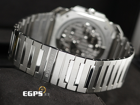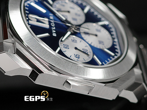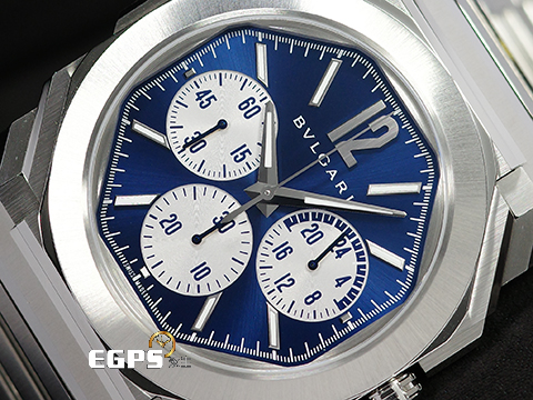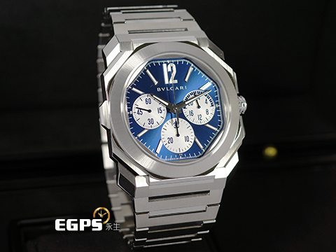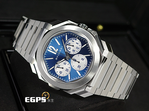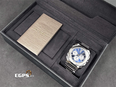 | BVLGARI 寶格麗 Octo Finissimo Chronograph GMT 不鏽鋼 八角形 103467 GMT 兩地時間 計時碼錶 藍色太陽放射紋面盤 超薄 鉑金環型自動盤 2026年保卡 自動上鍊 43mm |